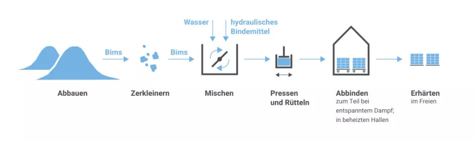 Im ersten Schritt der Herstellung werden alle Ausgangsstoffe sorgfältig gemischt, geformt und letztlich verdichtet. Zur Erhärtung kommt es durch das Lagern an der Luft. Die Erhärtung wird beschleunigt, indem sie in mit Dampf beheizten Hallen erfolgt. Die geforderte Festigkeit muss nach spätestens vier Wochen erfolgt sein und die Steine können verbaut werden.