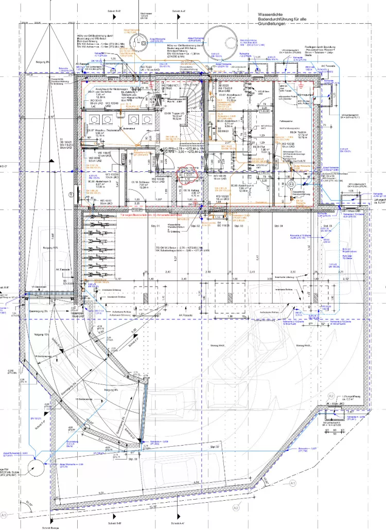 Darüber hinaus sind Durchstoßpunkte für die verschiedenen Hausanschlüsse wie Gas, Strom, Abwasser, Wasser verzeichnet. Diese Details werden meist in Maßstäben von 1 : 20 bis zu 1 : 5 abgebildet. Bei der Planung eines Einfamilienhauses können bereits für die Ausführungsplanung zwischen 15 und 25 Pläne zusammenkommen.