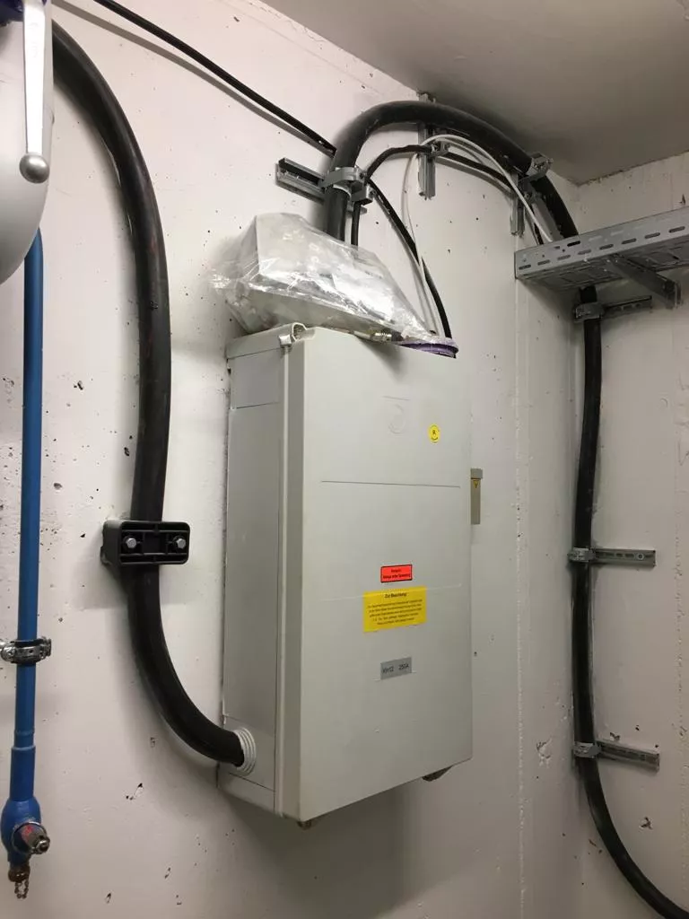 Im Keller befindet sich in der Regel der Strom-Hausanschluss mit dem Hausanschlusskasten als Schnittstelle zwischen dem öffentlichen Stromnetz und dem Stromnetz des Hauses. Dieser verplombte Kasten enthält die sogenannte Panzersicherung. Insbesondere bei sehr alten Häusern ist es angezeigt, dass der Elektrofachmann mithilfe des Gleichzeitigkeitsfaktors errechnet, ob diese Haupt-Haussicherung noch den bestehenden Anforderungen entspricht oder gegebenenfalls aufgelastet werden muss. Sollte dies der Fall sein, muss der Verteilungsnetzbetreiber (Versorger) mit einbezogen werden. Das heißt, dass eine stärkere Sicherung erforderlich ist. So muss oft auch die Hauptversorgungsleitung (Steigleitung) im Gebäude durch ein neues, stärkeres Kabel ersetzt werden. Bei der Verlegung von Steigleitungen, insbesondere bei Verlegungen in Treppenhäusern, ist darauf zu achten, dass die LAR (Leitungsanlagen-Richtlinie) eingehalten wird.