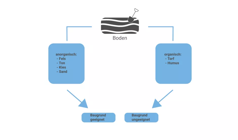 Den natürlich gewachsenen Untergrund (Boden), auf dem ein Bauwerk errichtet wird, bezeichnet man als Baugrund. Das Festgestein, das unter Einflüssen von Temperatur, Druck, Wasser, Wind, etc. über Jahrmillionen in verschiedener Intensität und Dauer zu den verschiedenen Böden verwittert ist, weist verschiedene Beschaffenheiten auf. Eine Einteilung der Böden wird aufgrund ihrer stofflichen Bestandteile vorgenommen und sie werden in zweierlei Böden untergliedert: