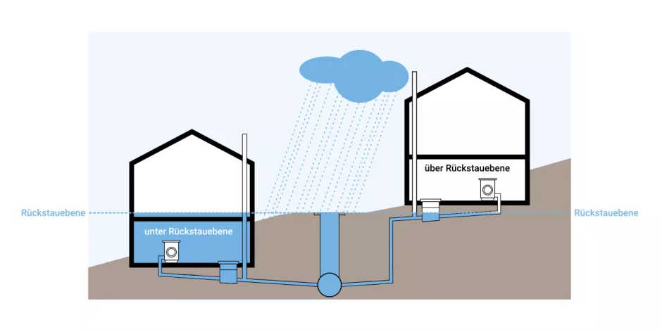 Bei einem Rückstau, wie er bei Starkregen oft vorkommt, läuft zuerst der öffentliche Kanal voll. Danach steigt das Abwasser in den Schächten bis zur Rückstauebene an und drückt in die Abwasserleitungen innerhalb des Gebäudes bis auf Höhe der Rückstauebene zurück. Räume, die tiefer als die Rückstauebene liegen – Keller zum Beispiel – können dann bis auf Höhe der Rückstauebene überflutet werden, wenn Entwässerungsgegenstände ohne Rückstausicherung installiert sind.