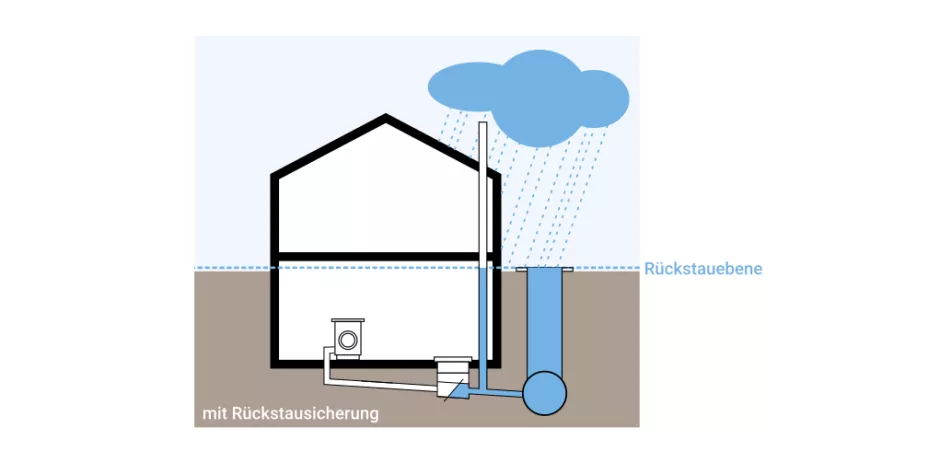 | Gut zu wissen | Das öffentliche Kanalnetz ist nicht dafür ausgelegt, Starkregen vollständig aufzunehmen. Im Gegenteil: Aus verschiedenen Gründen wird bewusst ein kurzzeitiger Aufstau im Kanalnetz bei starken Regenfällen mit hoher Niederschlagsmenge in kurzer Zeit in Kauf genommen. Deshalb ist es so wichtig, sich beziehungsweise sein Haus mit den geeigneten Mitteln vor Rückstau zu schützen. |