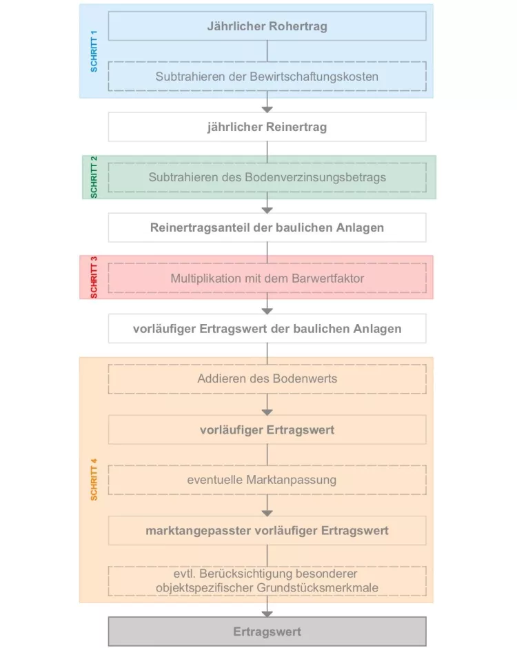 Formel: Ertragswert = vorläufiger Ertragswert der baulichen Anlage + Bodenwert +/- objektspezifische Anpassungen +/- Marktanpassungen